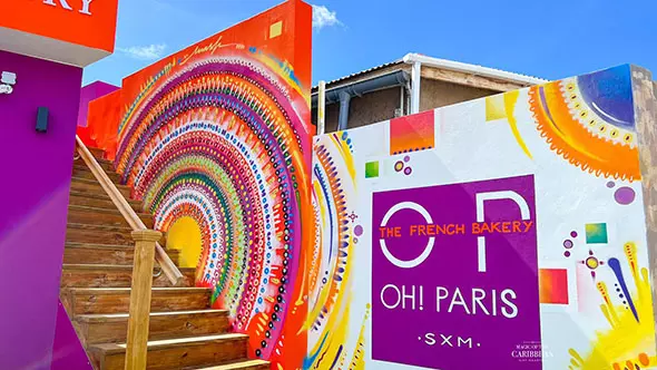 The "Oh! Paris" French Bakery in St. Maarten is adorned with a beautiful mural by Mash n Art on the exterior wall. This artistic enhancement adds a touch of creativity and charm to the bakery, reflecting the bakery's French-inspired theme. The mural, created by Mash n Art, showcases their unique style and artistic flair, making it a standout feature in the vicinity. The colorful and visually appealing mural adds to the overall ambiance of "Oh! Paris" and provides an inviting and delightful atmosphere for customers and passers-by.